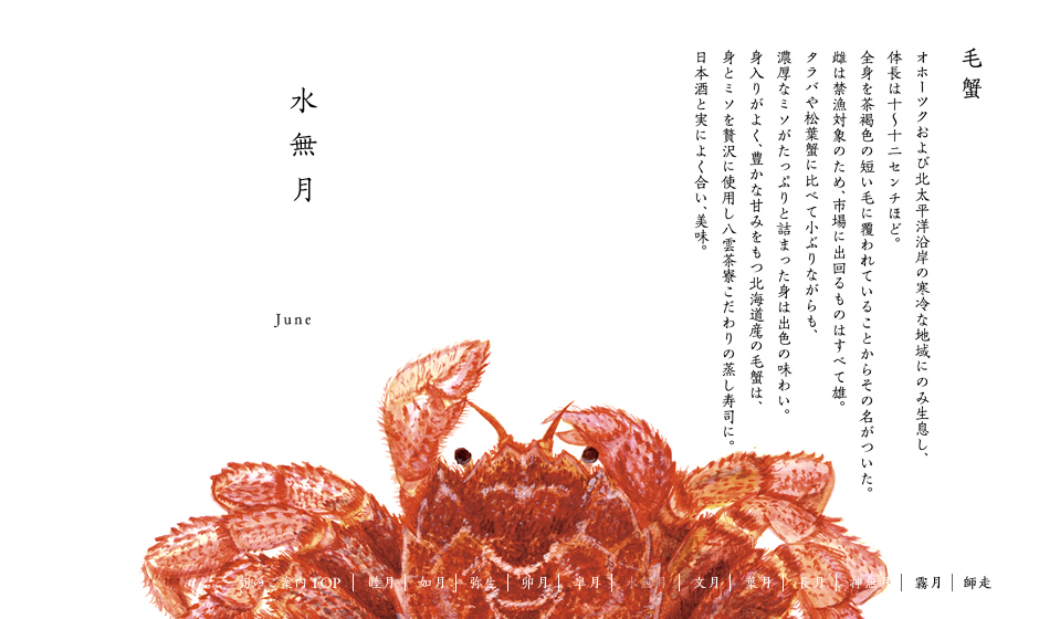 十二月/師走 鼈 十一月/霧月 香箱蟹 十月/神無月 伊勢海老 九月/長月 松茸 八月/葉月  鱧 七月/文月 夏野菜 六月/水無月 稚鮎 五月/皐月 毛蟹 四月/卯月 白子筍 三月/弥生 甘鯛 二月/如月 虎河豚 一月/睦月 猪 旬のご案内TOP